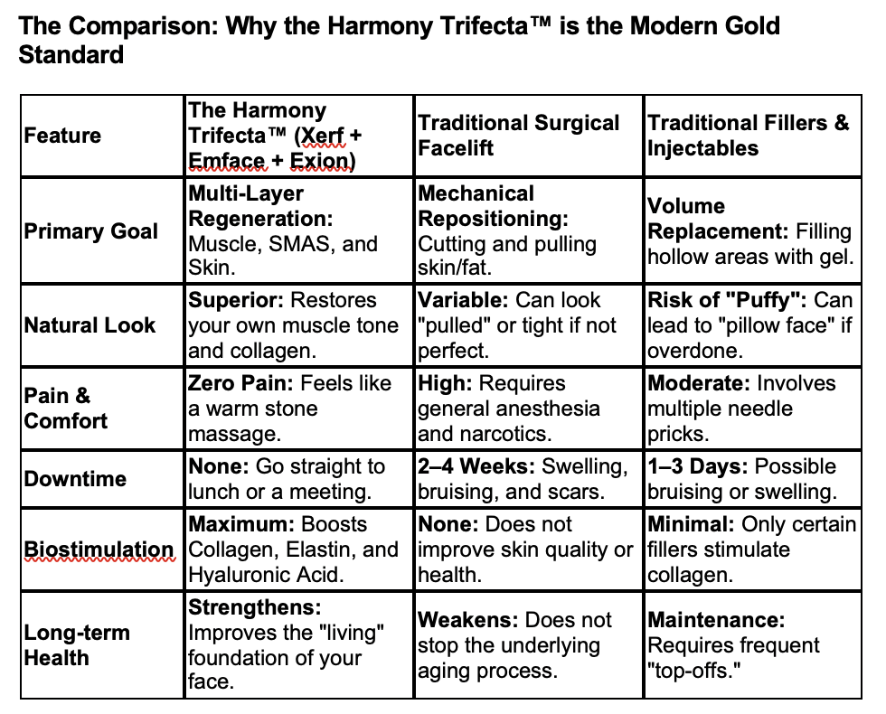 Most traditional treatments only address the surface. The Harmony Trifecta™ is a synchronized medical protocol designed to treat the face as a complete ecosystem. By targeting three distinct anatomical depths in one journey, we achieve a "natural snatch" and a lit-from-within glow that looks entirely your own.